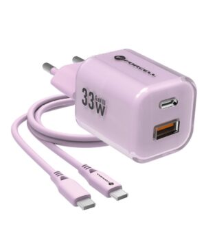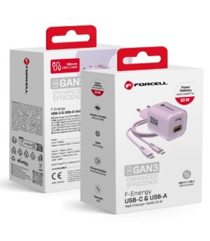 FORCELL F-ENERGY Crystal Color GaN III VT-41 travel charger with silicone cable with 1 x Type C + 1x USB A sockets, PD QC4.0 33W purple
