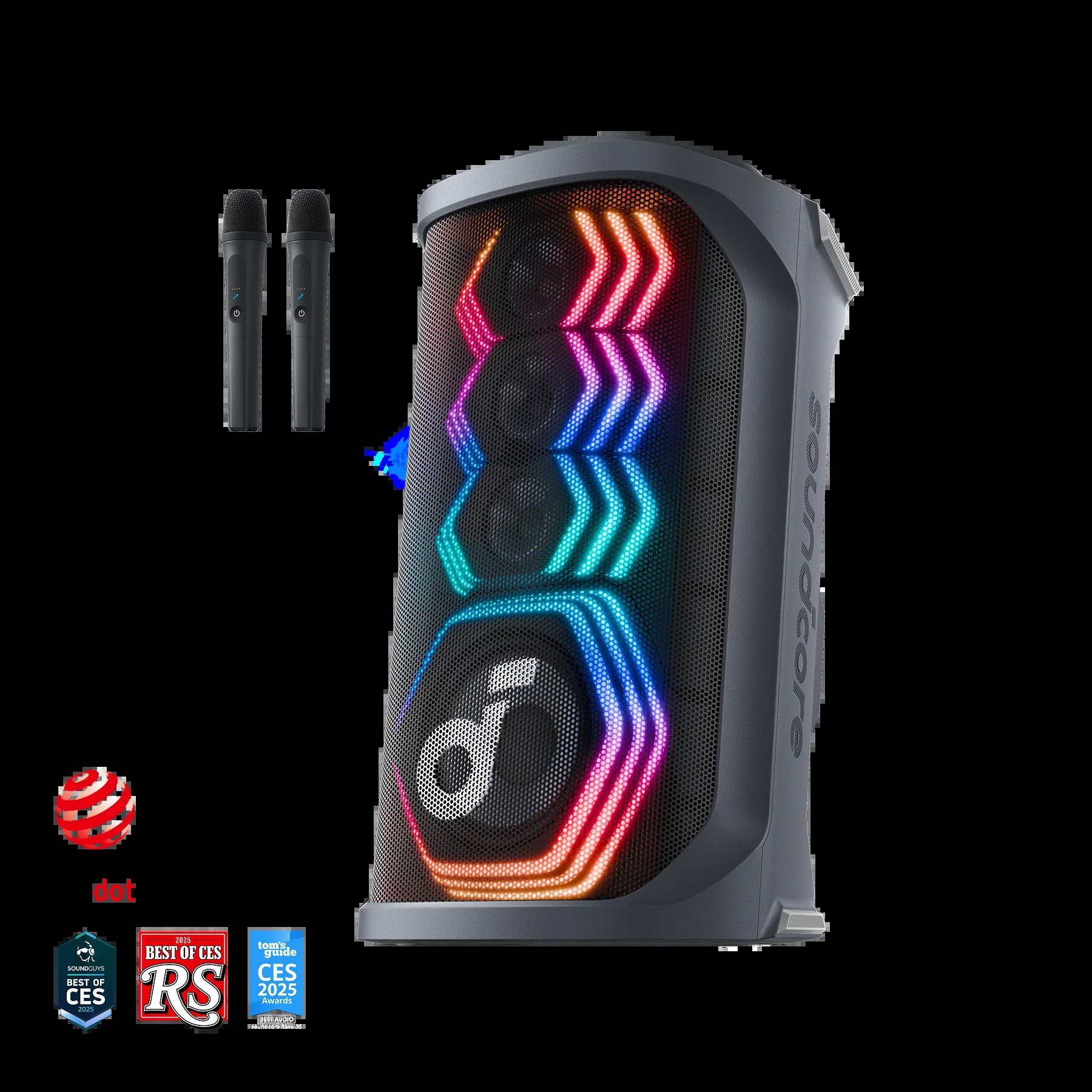 Επιπρόσθετα: AI-Driven Party Starter, 200W Powerful Sound, Immersive Beat-Synced Light Show, Dual Wireless Microphones, AI Vocal Removal, App Customization